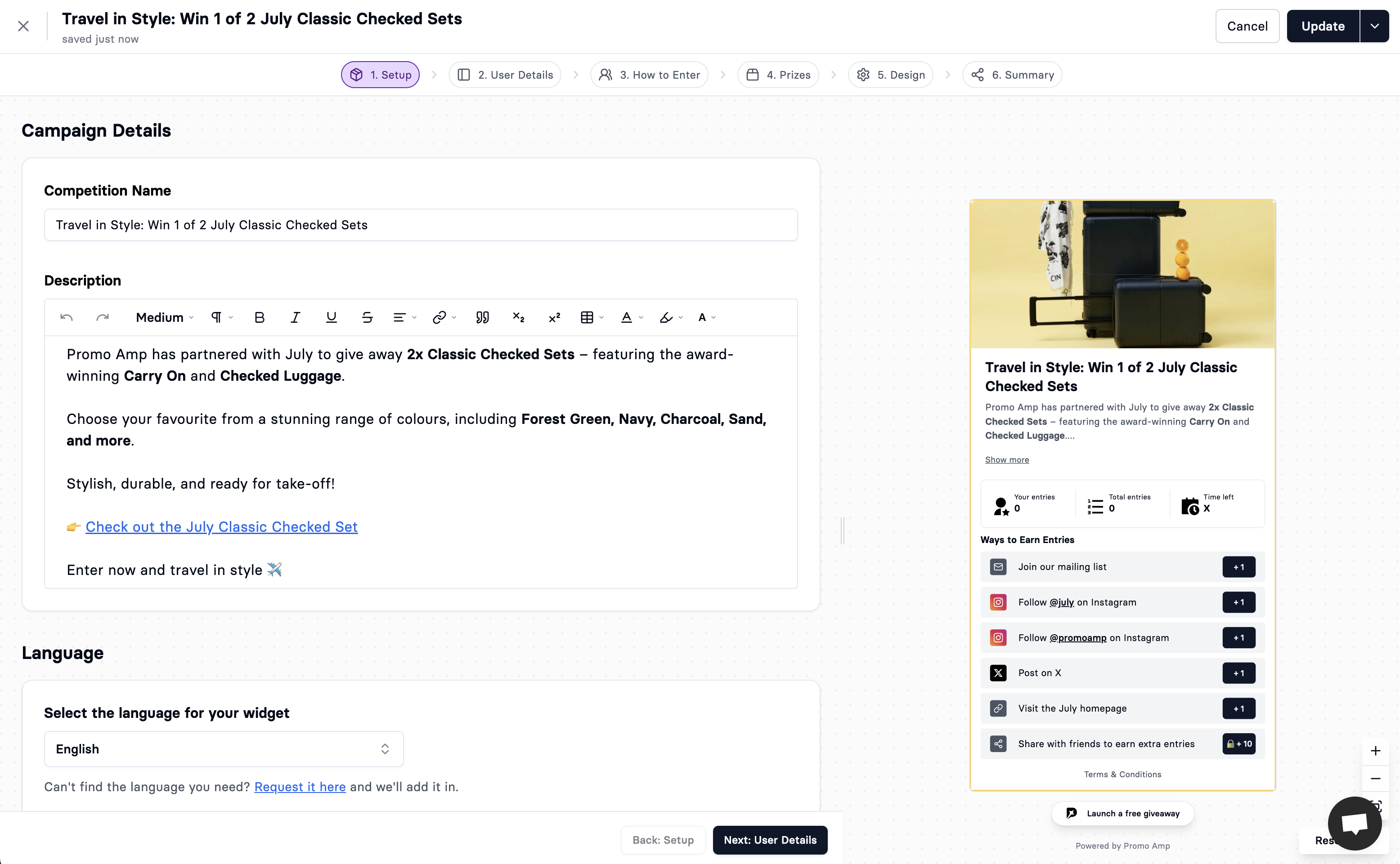 Promo Amp's AI can pre-build your entire campaign structure — complete with referral logic, prize tiers, rules, and even optimized copy. It's perfect for non-marketers or busy founders.